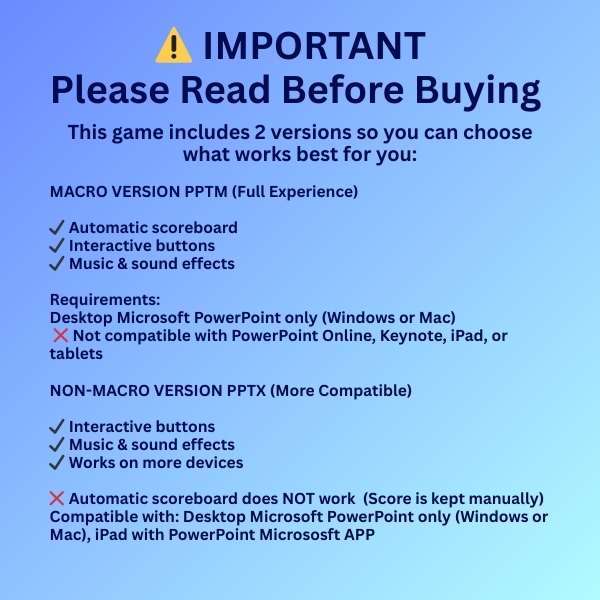 The game can be played on earlier versions of PowerPoint without the automatic scoreboard. It is designed for computers and does not work with Google Slides, Chromebook, Keynote, or mobile phones.